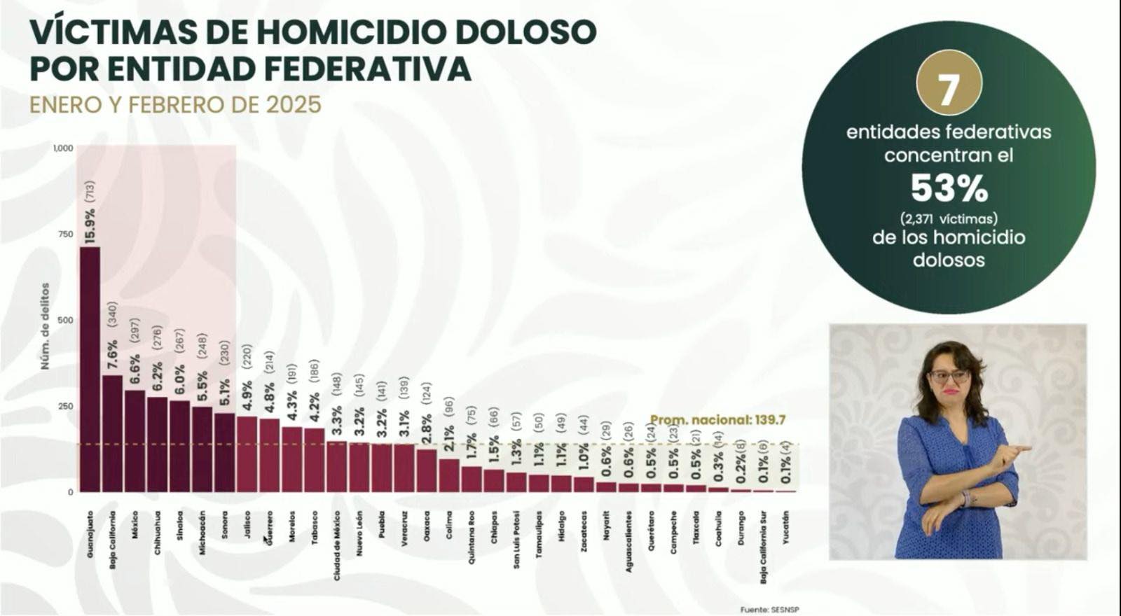 El reporte oficial destaca que siete estados concentran el 53% de los homicidios dolosos registrados en el país durante el inicio del año, con Guanajuato, Baja California y Estado de México encabezando la lista. Guerrero, que en años anteriores figuraba entre los primeros lugares de violencia, ahora se ubica en el noveno puesto.