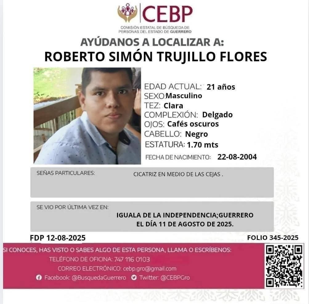 Un joven de 21 años, identificado como Roberto Simón Trujillo Flores, quien había sido reportado como desaparecido desde la tarde del lunes, fue localizado sin vida la noche de este martes en un camino de terracería que conecta las colonias Tres Iguanas y Loma Pajaritos, en Iguala de la Independencia.