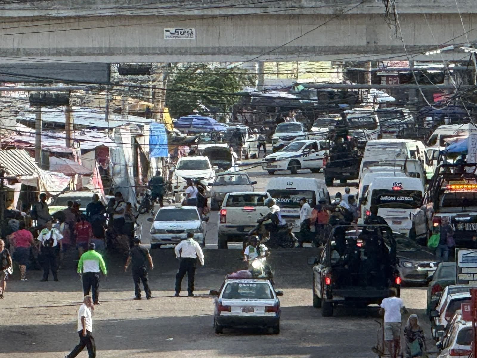Elementos de la Policía Estatal, en coordinación con personal de la Secretaría de Marina y la Policía Ministerial, desplegaron un operativo para asegurar el perímetro, resguardar la zona y proteger a comerciantes y transeúntes.