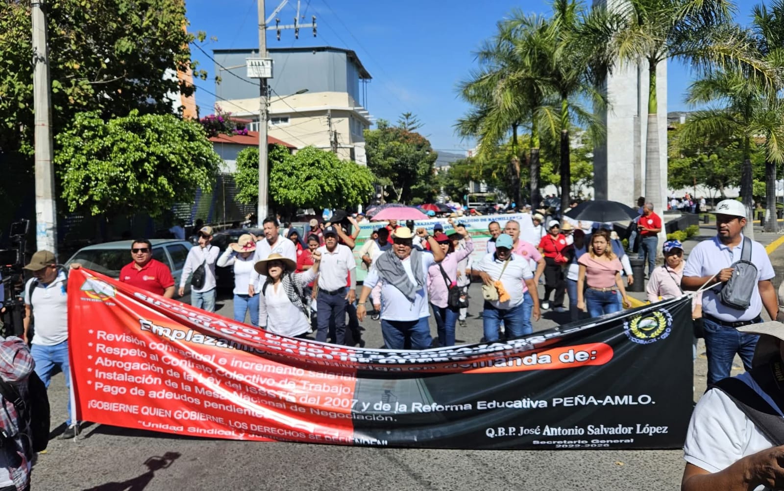 La movilización inició por la mañana en la alameda “Granados Maldonado”, donde se congregaron cientos de trabajadores del Cobach, acompañados por integrantes de otros sindicatos, entre ellos empleados del DIF estatal y personal de Bomberos y Protección Civil. Los manifestantes recalcaron que su participación forma parte del apoyo al magisterio nacional para exigir la reinstalación de la mesa de trabajo con el Gobierno Federal.