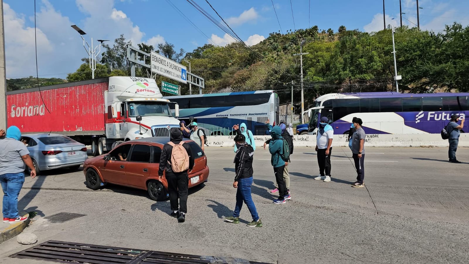 El bloqueo inició minutos antes de las 14:00 horas, cuando los normalistas atravesaron varios autobuses y un camión de una cadena comercial que mantenían retenido, impidiendo el paso en ambos sentidos.