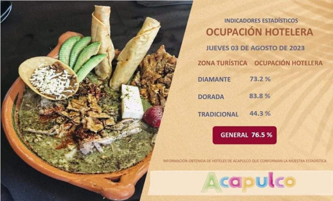 Se informó en un boletín que de acuerdo con datos de la Secretaría de Turismo Municipal, Acapulco reportó este jueves una ocupación hotelera general del 76.5 por ciento. La zona Dorada del puerto registró este jueves una ocupación hotelera del 83.8 por ciento; el Acapulco Diamante obtuvo 73.2 puntos porcentuales y la zona Tradicional reportó una afluencia del 44.3 por ciento.