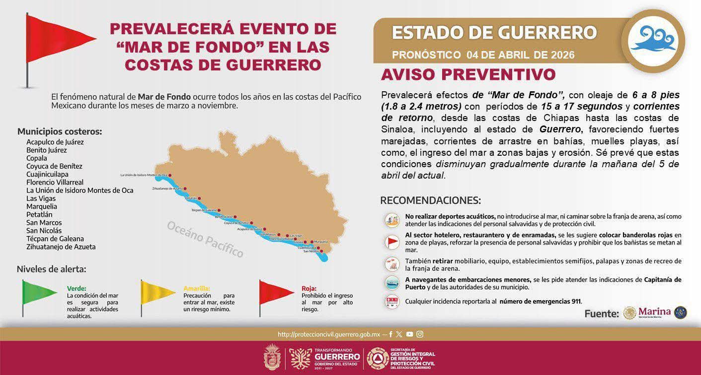 Autoridades del estado de Guerrero emitieron un aviso preventivo ante la presencia del fenómeno de mar de fondo, el cual estará generando condiciones de riesgo en diversas zonas del litoral durante los próximos días.