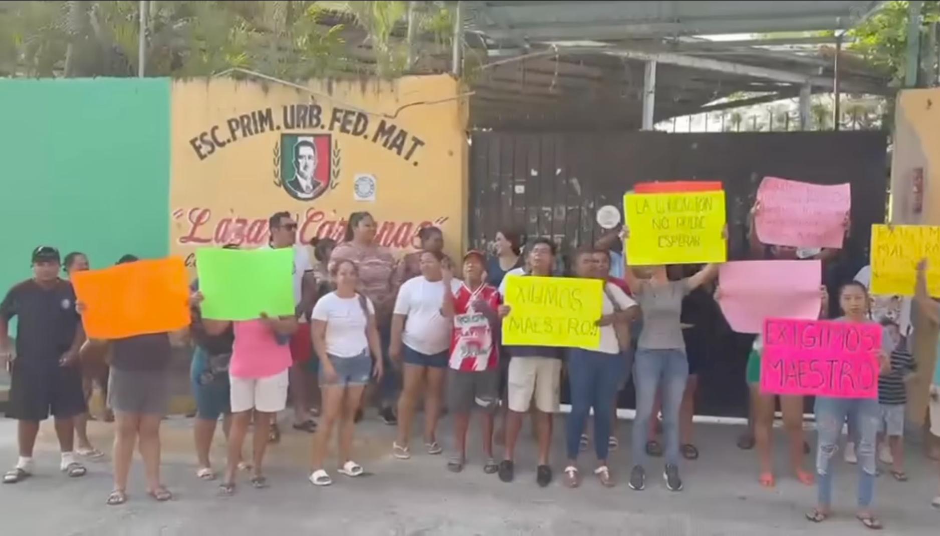 Padres de familia del grupo de 3° “A” de la Escuela Primaria Matutina Lázaro Cárdenas, en la colonia Ciudad Renacimiento de Acapulco, se manifestaron este viernes a las afueras del plantel para exigir la asignación inmediata de un docente.