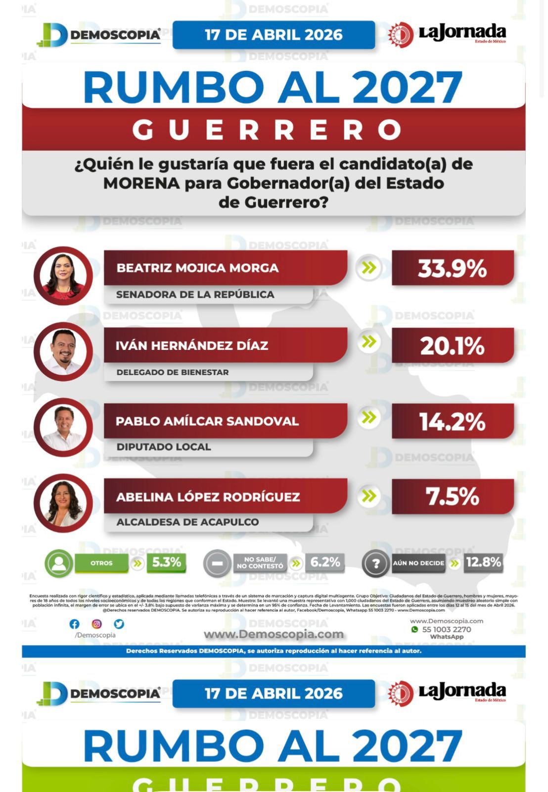 El estudio señala además que Morena mantiene una preferencia de 44.2 por ciento en Guerrero, consolidándose como la principal fuerza política en la entidad.