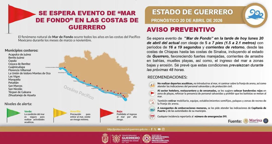 La Secretaría de Gestión Integral de Riesgos y Protección Civil informó que a partir de la tarde de este lunes se prevé un nuevo evento de Mar de Fondo en las costas de Guerrero, con oleaje de entre 1.5 y 2.1 metros de altura.
