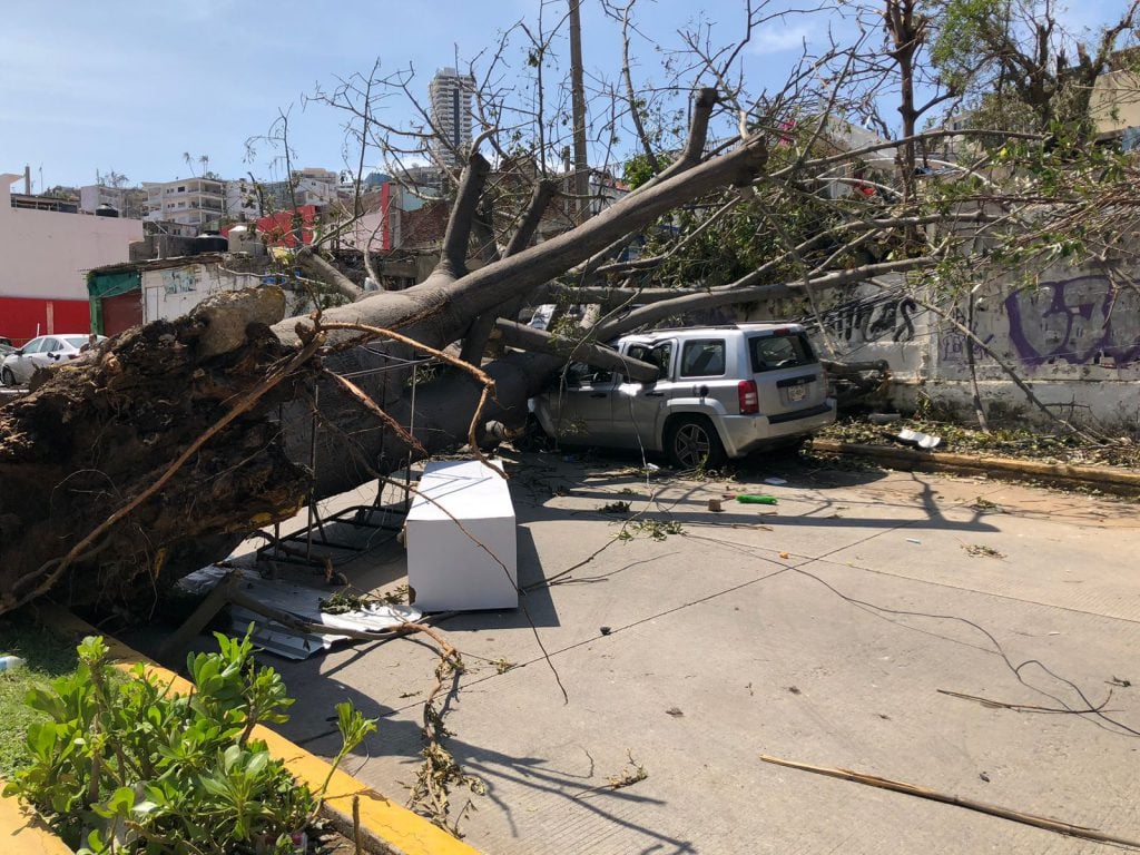 La avenida Cuauhtémoc que conduce a la parte poniente de Acapulco aún continúa bloqueada con escombros, lodo y ramas de árboles caídos.