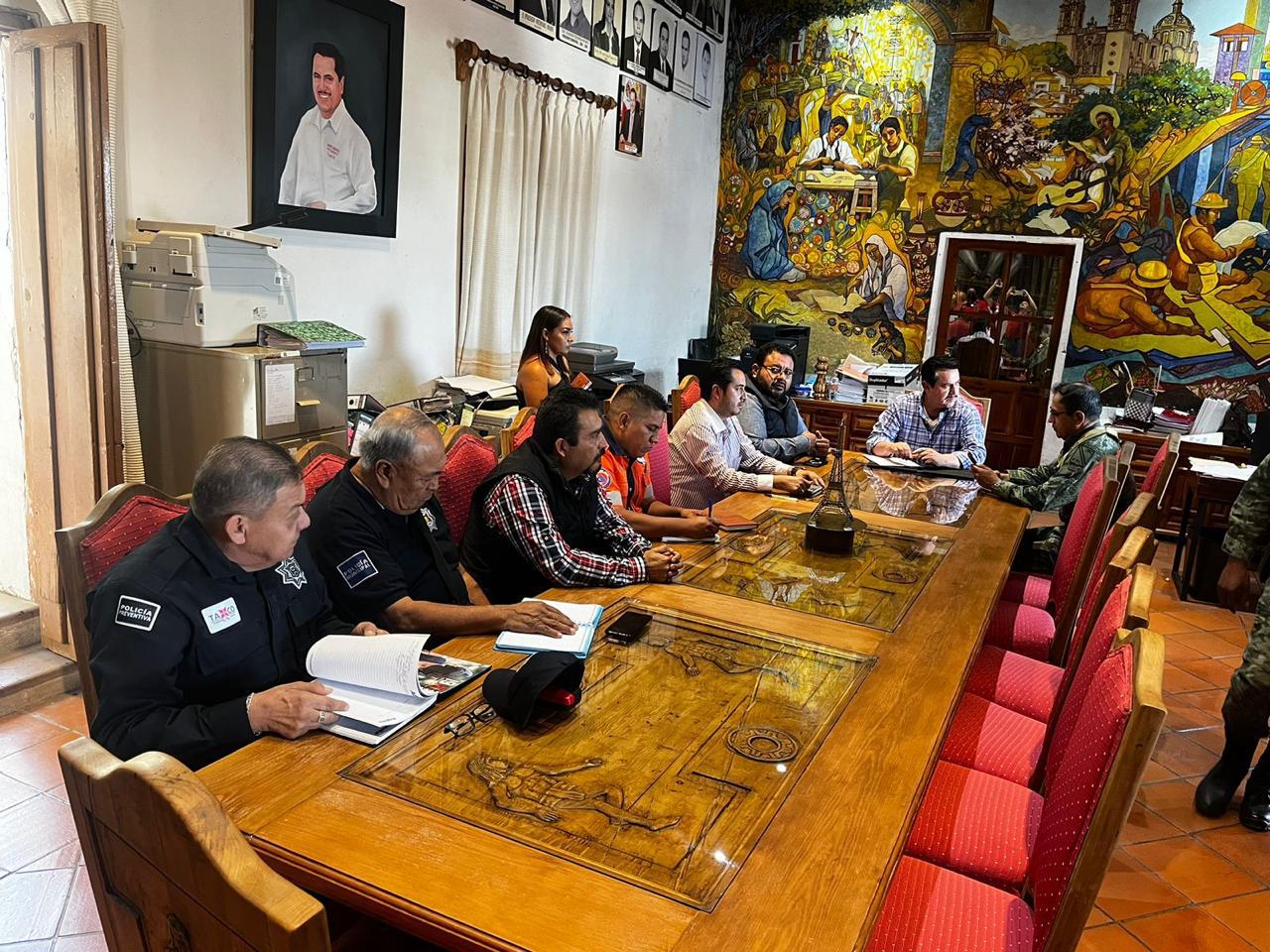 La tarde de este miércoles en las instalaciones de la Sala de Cabildo de Palacio Municipal de Taxco, se realizó esta reunión de trabajo donde participaron funcionarios de la Secretaría General de Gobierno del estado; el alcalde Mario Figueroa Mundo, así como Rodolfo Martínez Menes, Delegado de Gobierno en la zona Norte; el Coordinador de la Policía Estatal en la región norte, Mariano Bernal González, así como mandos de la SEDENA y de la Policía Estatal.
