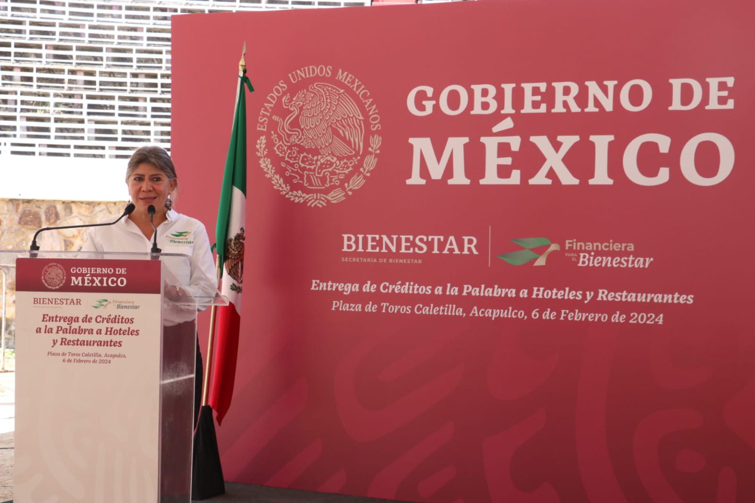 Durante la entrega de créditos a la palabra a hoteles y restaurantes en Acapulco, junto a la directora general de Financiera para el Bienestar (Finabien), Rocío Mejía Flores, y autoridades del gobierno de Guerrero, la secretaria Montiel manifestó el respaldo del Gobierno de México que está pendiente de la recuperación de Acapulco; se realizan visitas para verificar el avance de la recuperación y dejar constancia de manera transparente del uso de los apoyos.