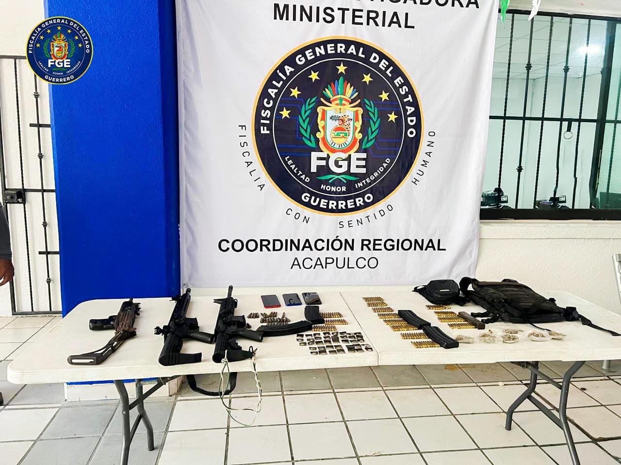 En acciones interinstitucionales realizadas en el municipio de Acapulco, la Fiscalía General del Estado de Guerrero (FGE Guerrero), en coordinación con el Ejército Mexicano, Guardia Nacional y Policía del Estado, logró la detención de un hombre y una mujer, así como el aseguramiento de armas, cartuchos, cargadores, equipo táctico, vehículos y presunta droga.