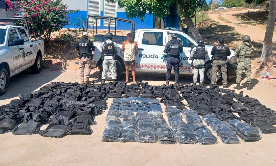 Durante dispositivos de seguridad en la cabecera municipal de San Marcos, se aseguraron 195 placas balísticas, 95 chalecos tácticos, 16 cargadores abastecidos y nueve armas cortas de diversos calibres.